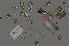 I should explain.This is the battle report from my wonderful and thoroughly enjoyable match a couple of weeks ago against Fallen 73rd over at Unforgiven Angels. My army list can be found here and 73rd's will be added to this post soon. It was 1500pts and a chance for me to field a detachment from the Cadian 24th's 1st Battalion - basically all of my light vehicles (less the W-i-P Wyvern)!But here's the thing, and I've a feeling that some of you purists out there will disown Drax for this:we played online.Yes. 73rd is an absolutely marvellous opponent: thoroughly sporting, a proper gentleman and up for a laugh...but I've never met the chap. He lives over 200 miles away (for those of you in the States, 200 miles is a huge distance over here!) and I live in the deep countryside with no car and busy weekends. [Seriously: even when we hire a car (like today) it still takes us over half-an-hour to reach a road with two lanes!]I don't understand any of it, and I simply cannot use the right technical language, but there's a program called Vassal which replicates (extremely well) a 2-D game of 40K with all the requisite pieces, as you can see below. I've played 73rd like this thrice now, and each game's been a corker, but this latest one was simply superb! We're usually happy to forgo technicalities for the sake of cinematic style, and boy, did we get it in this one! From the hapless Dark Angel missiles pinging off the chimera hulls to the final what-the-hell showdown between his terminator chaplain and my heroic young officer, this was Good Fun. Add in a sentinel bonking a Deathwing terminator on the head with a multilaser and you've just about got an idea of the joy of it - even in inglorious 2-D!The details and a commentary will be added bit-by-bit, and I'll let you know when I have...but here are the teams, and the screenshots follow: